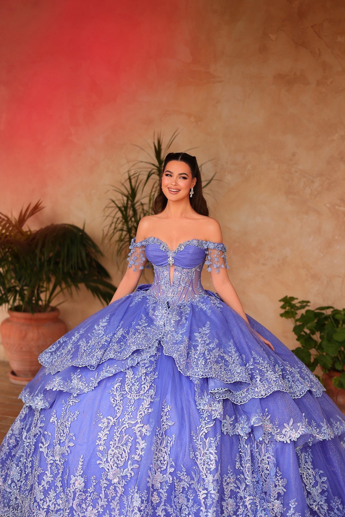 Step into a fairytale with the Amarra 54105 Dress, a stunning quinceañera gown designed to dazzle. This romantic showstopper features a sheer, structured corset adorned with delicate embroidery and shimmering lace appliqués. Off-the-shoulder sleeves with playful hanging embellishments perfectly frame the sweetheart neckline. Layers of glitter tulle create a full ball gown skirt that promises a dramatic entrance, while the lace-up corset back ensures a flawless, cinched silhouette. Crafted from embroidered lace, glitter tulle, and sheer mesh, this dress brings magic to every moment.