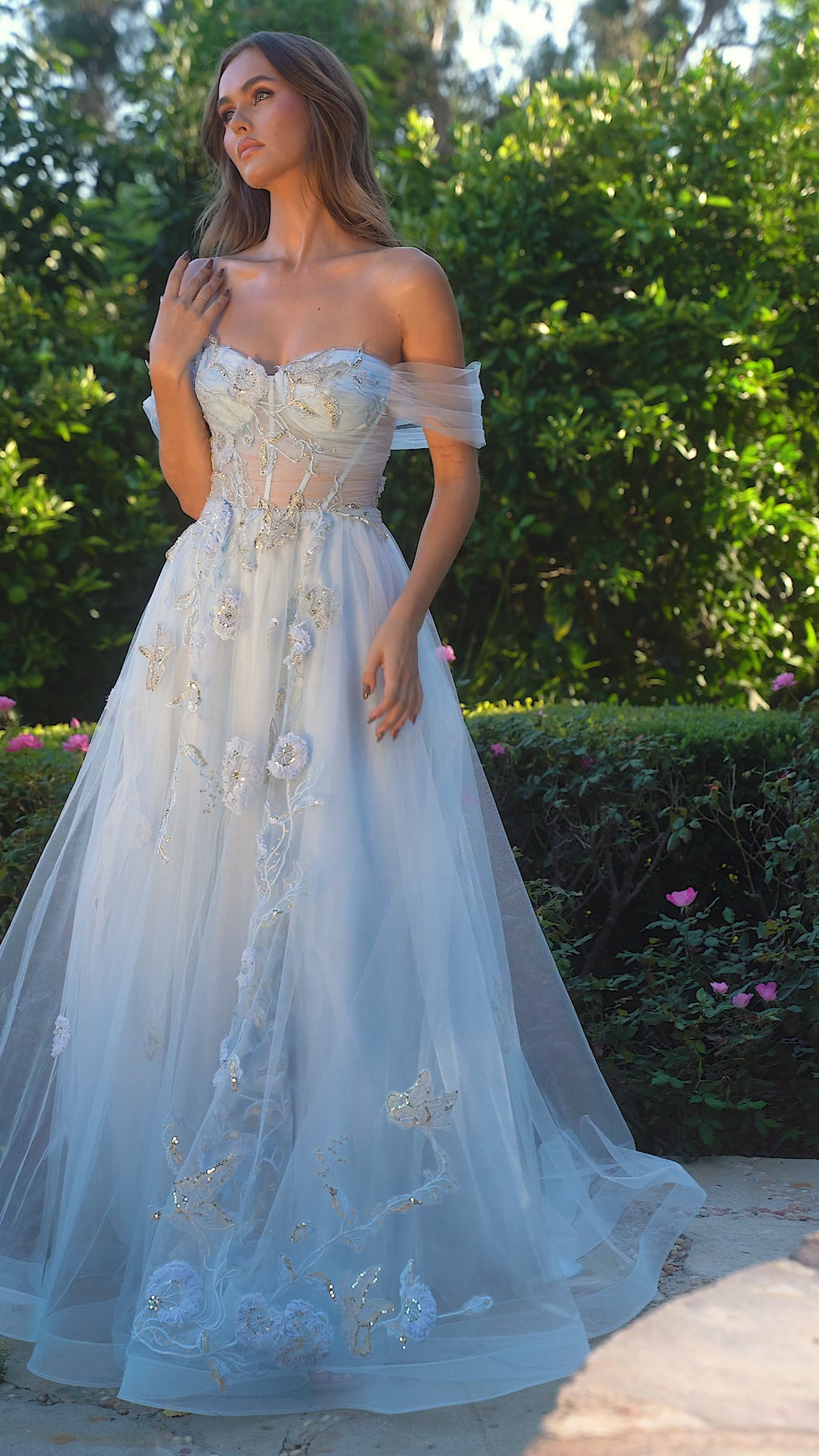 Be swept away by the enchanting beauty of the ANDREA AND LEO A1246 dress. A garden of floral and butterfly appliqué meets tulle layers in this off-the-shoulder A-line gown, creating a whimsical and ethereal look. The sheer boned bodice adds sophistication, while the tulle sleeves bring a touch of grace. Fall in love with this canvas of love and style, where every movement becomes a dance of elegance. Step into a world of enchantment and let the romance unfold.