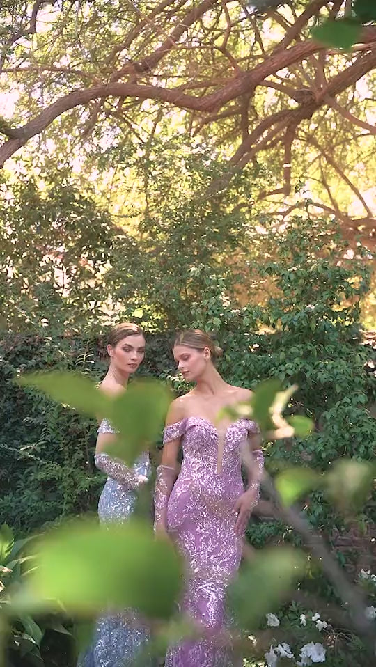Step into a world of fantasy in this off the shoulder gown. You will feel nothing short of glamorous in this fairytale-worthy ensemble, that is beautiful and unique. This exquisitely fitted mermaid dress gives you the perfect hourglass figure that you have been dreaming of. Feel like a queen as you make your grand appearance in this gown, which features a plunging sheer neckline to keep all eyes on you and fully glass beaded print for an elegant sparkle. With off-the-shoulder folded sleeves and matching tulle embellished gloves, nothing will remain unnoticed about this dreamy ensemble! Create a show-stopping vision at prom or whichever special occasion living la vie en rose awaits.
