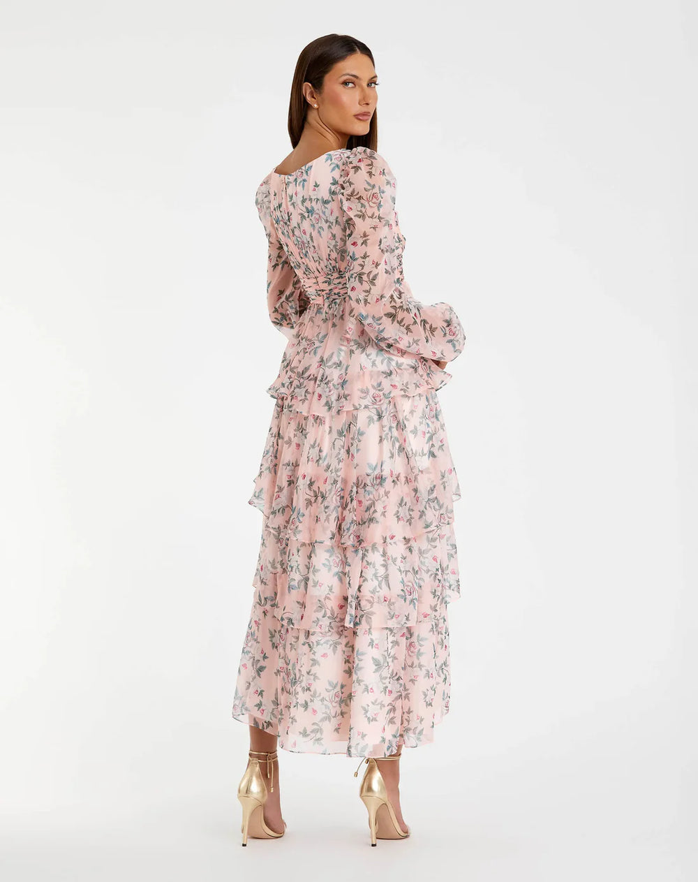 This elegant midi dress features long chiffon sleeves and a thigh-high slit, enhanced by tiered ruffle accents. Crafted from floral-printed chiffon and fully lined for comfort, it showcases a V-neckline with a wrapped bodice design. The semi-sheer sleeves and back zipper complete the refined look. This pretty floral dress embodies romantic sophisticated charm.