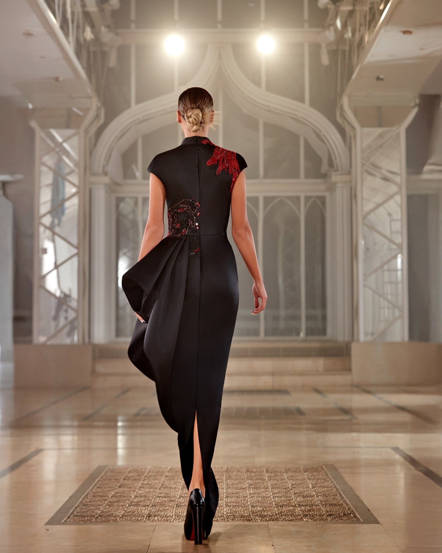 Elevate your evening with the Edward Arsouni 1108 Dress, a stunning couture piece that seamlessly blends sophistication with modern allure. This luxurious long dress features a refined high neckline and graceful half sleeves that exude timeless elegance. The dramatic high back slit adds movement and contemporary flair, while delicate sequin embellishments cascade from shoulder to waist, creating a mesmerizing focal point that catches light beautifully. Crafted with meticulous attention to detail, this gown is designed for those who appreciate haute couture craftsmanship and desire to make an unforgettable statement at any special occasion.