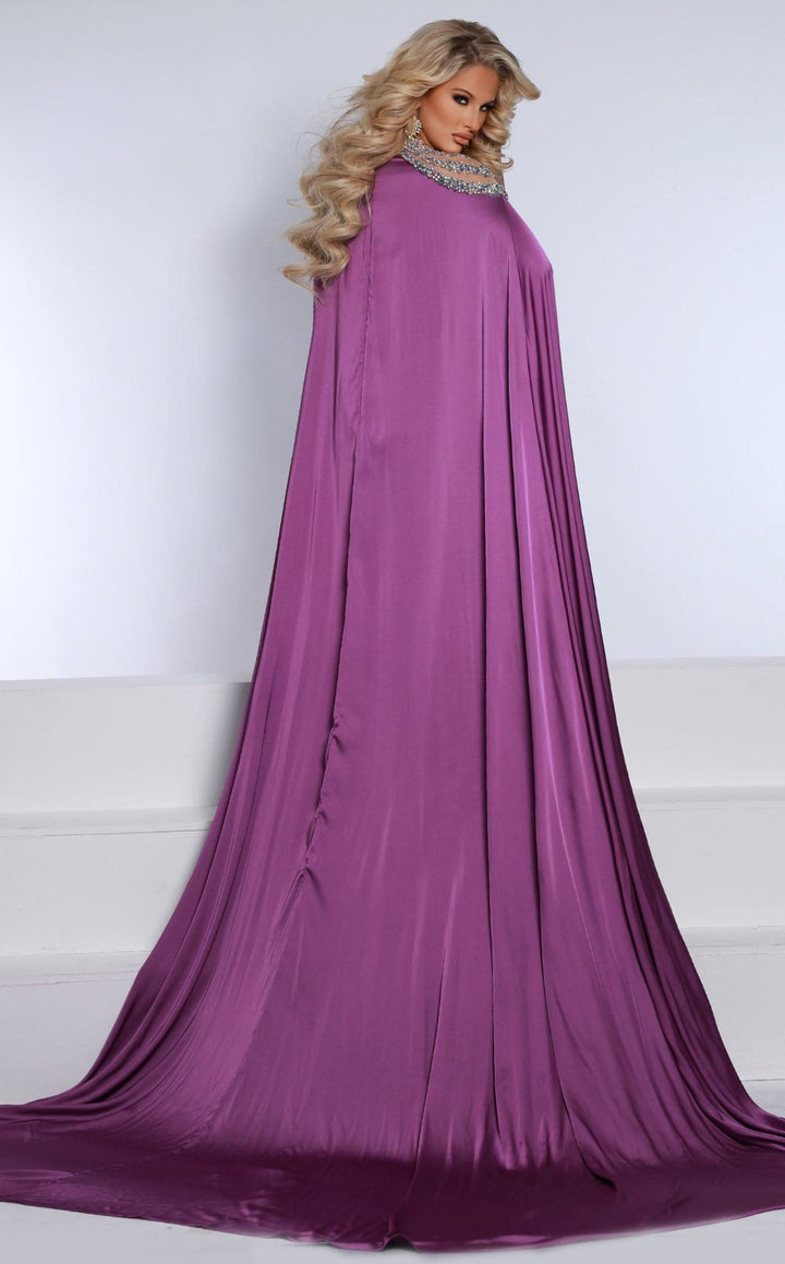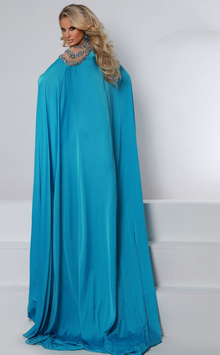 Step into the spotlight with the Johnathan Kayne 2628 Dress, featuring a playful halter neckline adorned with shimmering layered straps. This sleeveless beauty hugs your natural waist before flowing into a full-length skirt with a daring thigh-high slit. Sequins sparkle all over, while a dramatic cape adds a touch of flair, making every entrance unforgettable.