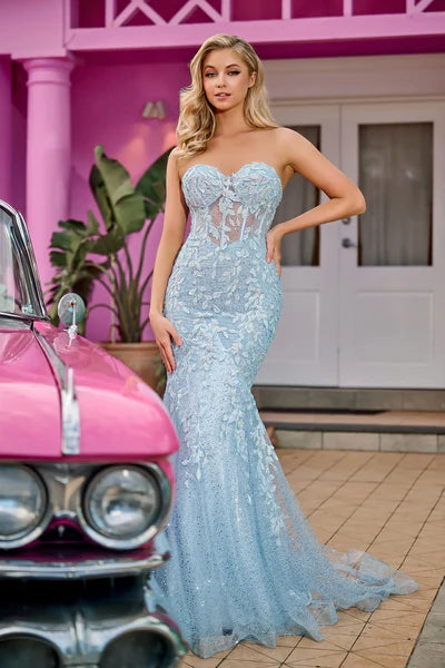 Make a statement in this long floral applique evening dress. The strapless silhouette and sparkly fabric pairs perfectly for prom nights and other formal events. Simply slip on your heels, add a sparkly clutch and this dress will help you dazzle and shine through the night.