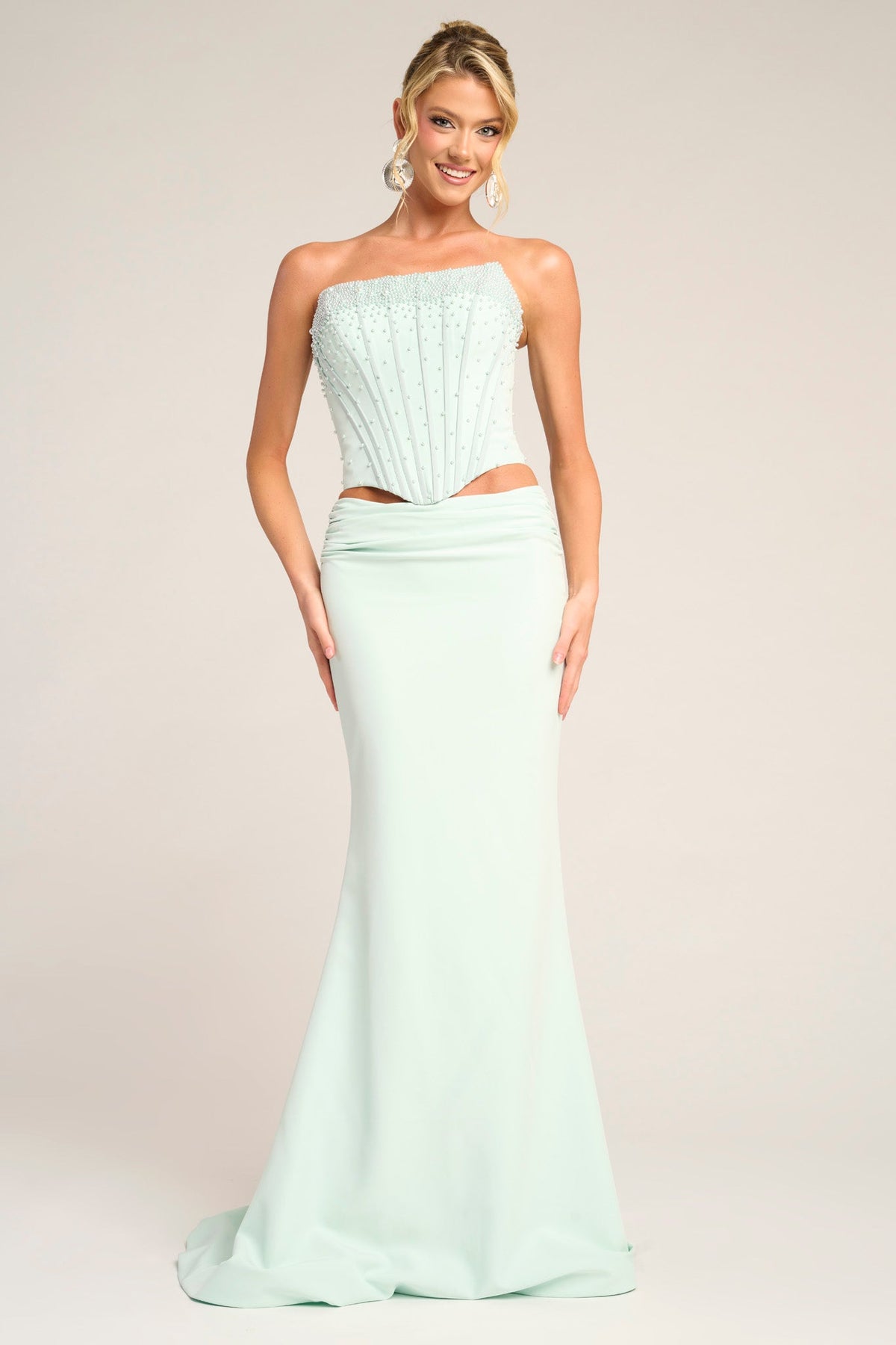 PS26007 is a two-piece gown which combines effortless sophistication with contemporary allure. The strapless corset-style bodice features delicate bead embellishments and structured boning that sculpts the figure. Paired with a floor-length skirt, the look strikes the perfect balance between structure and softness.
