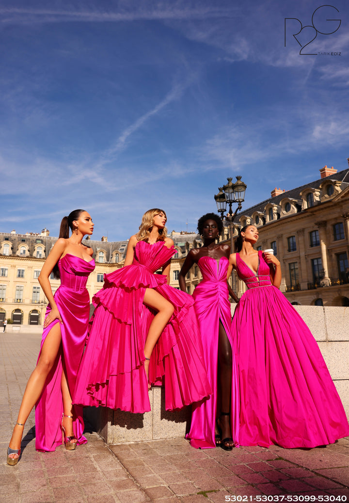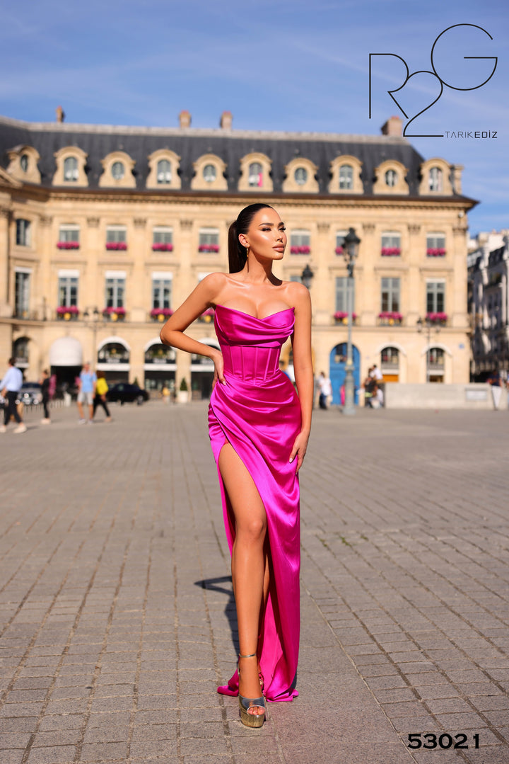 This stunning TARIK EDIZ 53021 dress features a long slit and straight-across neckline, creating a timeless and elegant look. The strapless design and open back add a touch of femininity, while the satin fabric elevates the dress to a luxurious level. Perfect for bridesmaids, prom, or any evening event.