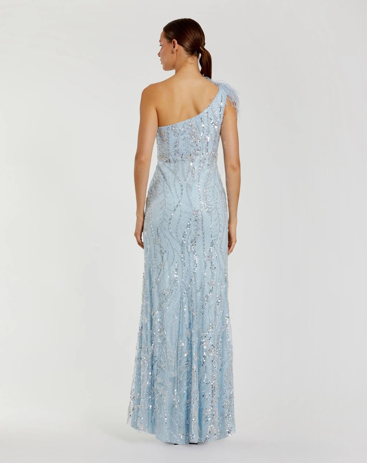 This elegant gown features an asymmetrical one shoulder neckline and a delicate feather cap sleeve. The embellished fabric adds a touch of glamour to this already stunning piece. Perfect for any formal occasion, this gown will have you feeling confident and stylish.