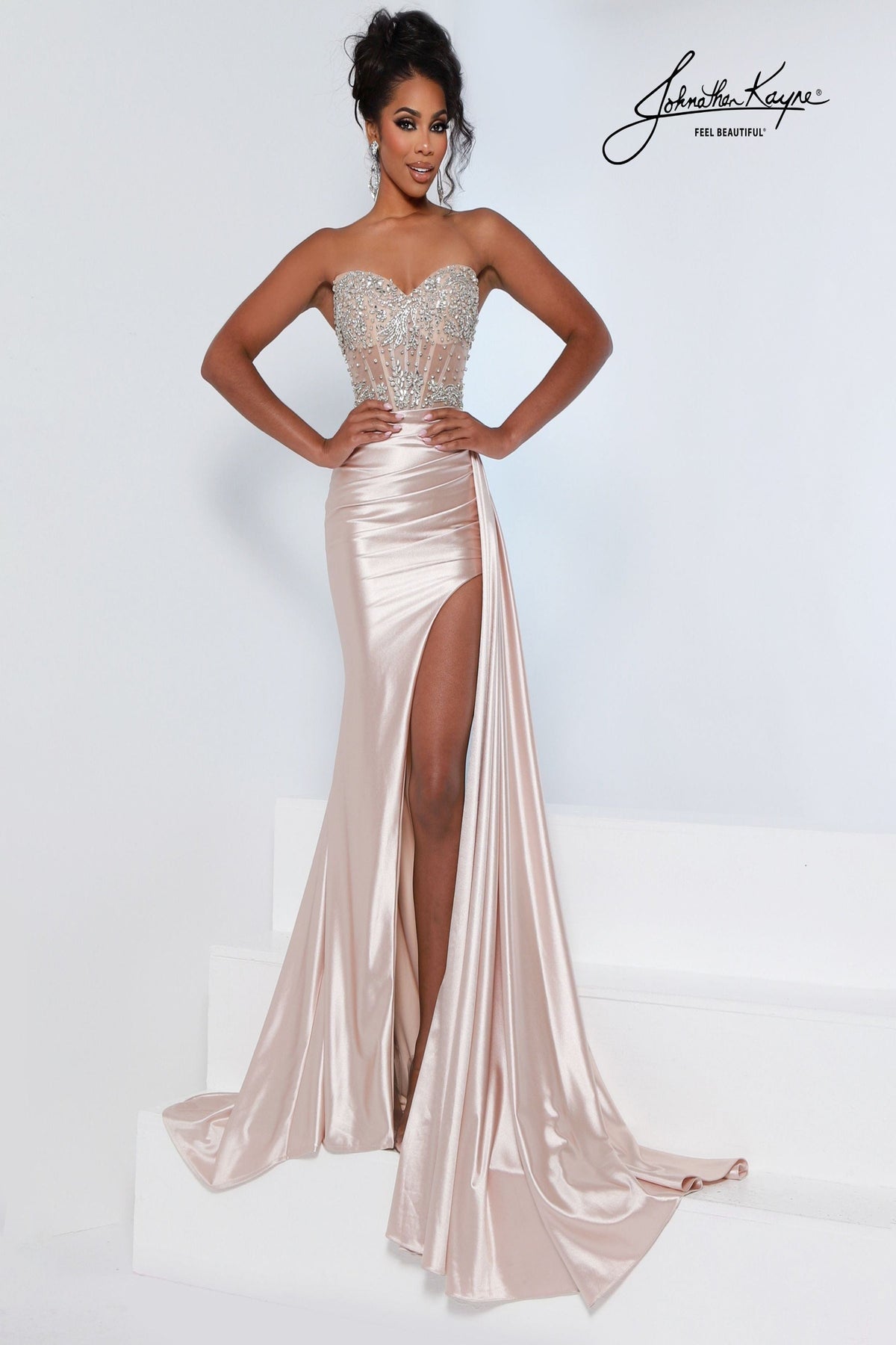 Johnathan Kayne 3280 Dress Turn heads in this stunning stretch lycra gown that celebrates your silhouette with confidence. The strapless beaded corset bodice adds glamorous sparkle and structure, while the thigh-high slit and flowing side train deliver movement and drama. Designed for those unforgettable moments whether it's prom night or a red-carpet-worthy event this dress empowers you to feel absolutely radiant and show-stopping.