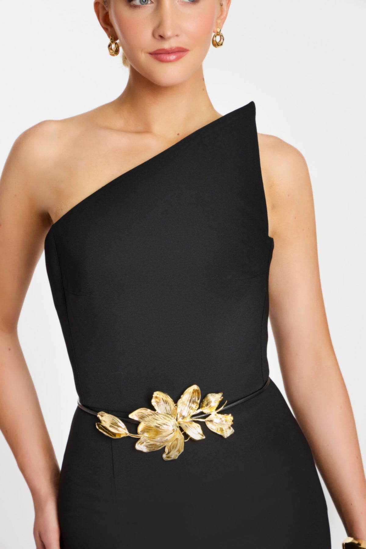 Elevate your evening wardrobe with the Jovani 48659 jumpsuit, featuring a sleek one-shoulder design that exudes modern sophistication. The striking black fabric provides a timeless backdrop, while the gold floral belt adds a refined touch of elegance and visual interest. Perfect for formal events or upscale gatherings, this jumpsuit combines contemporary style with expert tailoring to ensure a flattering fit and confident presence.