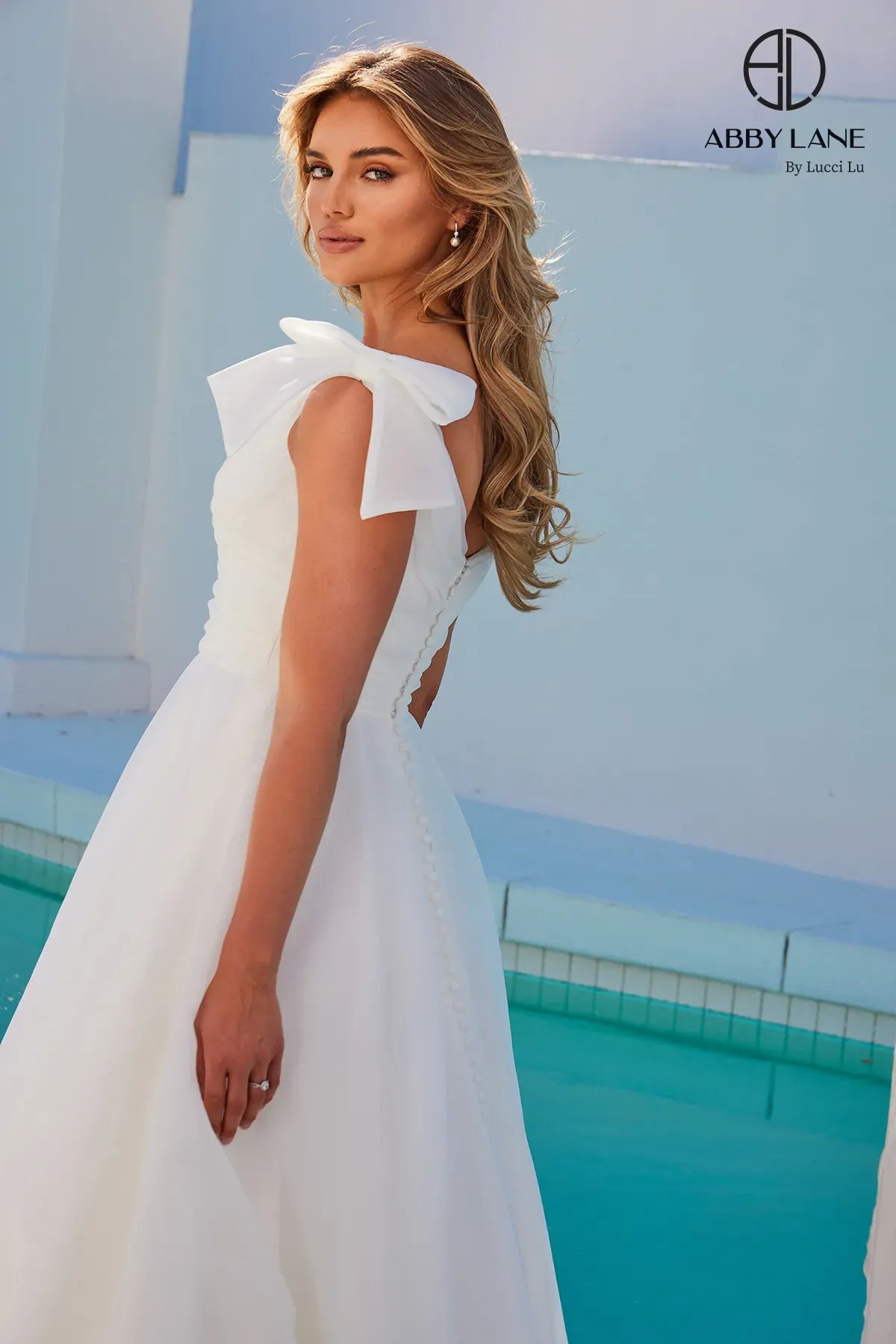 Look breathtaking in this organza long sleeveless V-neck wedding dress with an A-line skirt by Abby Lane 97286.