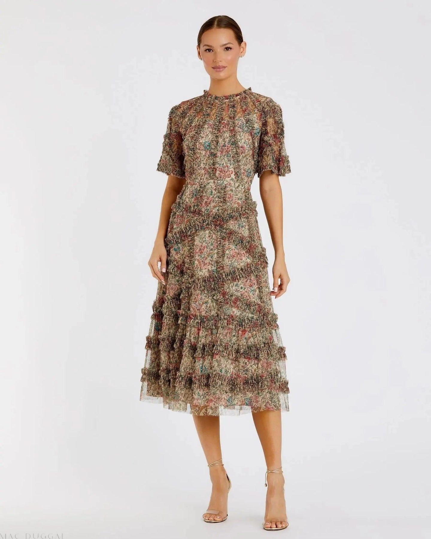 Effortlessly romantic, this flowy floral midi dress features an illusion high neckline, flutter sleeves, and ruffled detailing. Perfect for brunches, garden parties, or daytime celebrations.