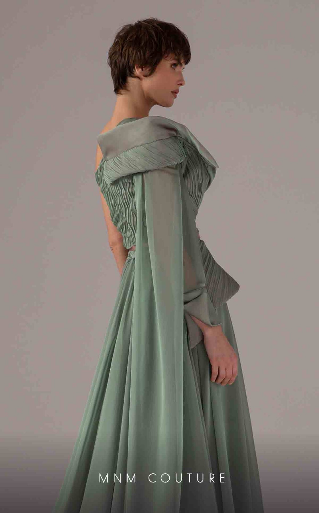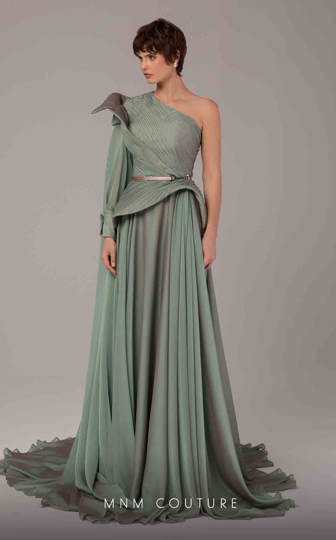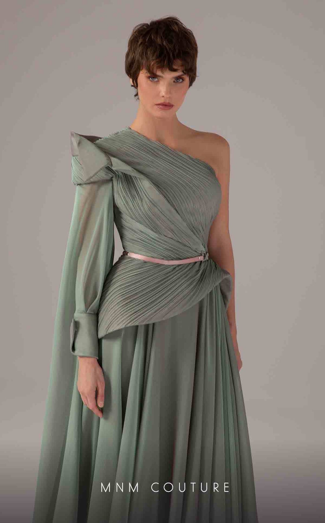 Expertly designed for special occasions, the MNM Couture E0097 Dress exudes elegance and sophistication. With a one shoulder, one sleeve design, this long evening dress is perfect for the mother of the bride. Make a statement and feel confident in this timeless and stylish piece.