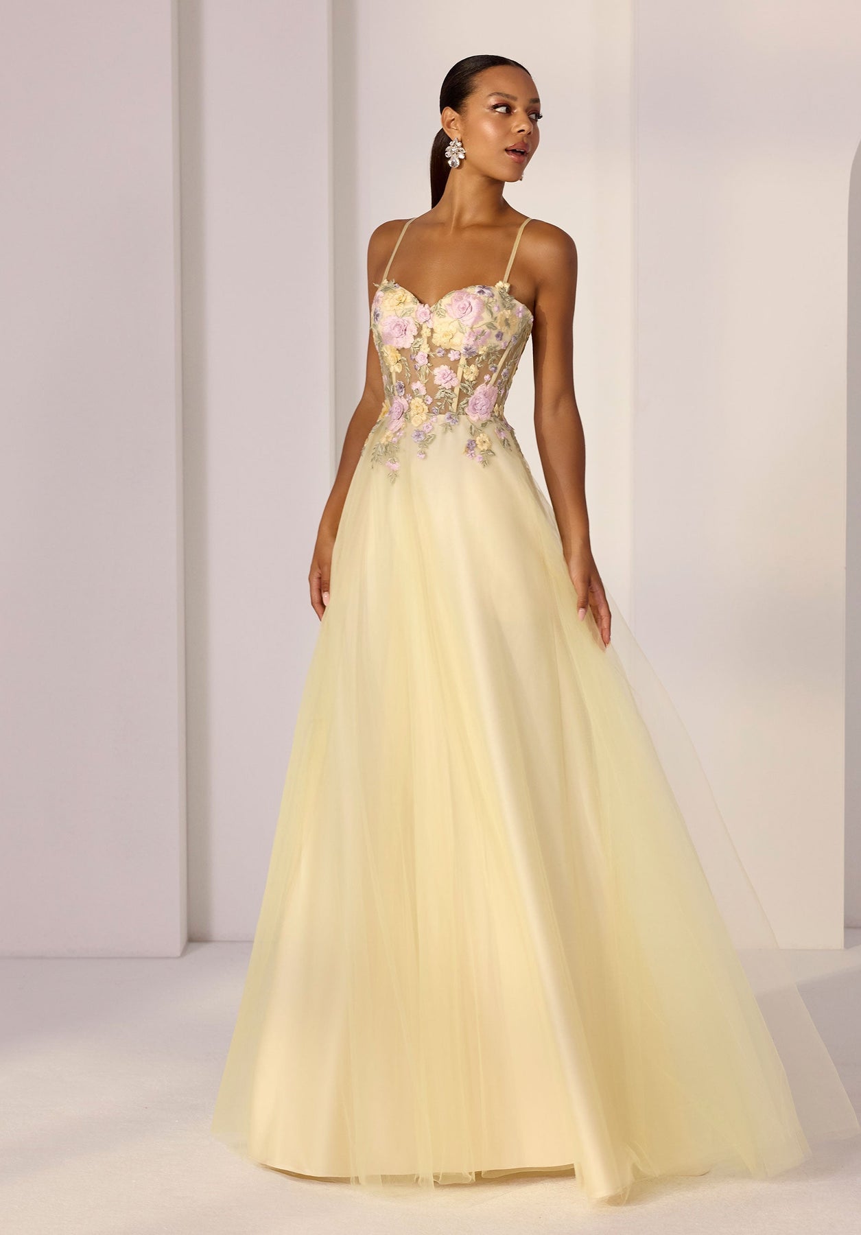 Romantic meets modern in this dreamy tulle A-line party dress. The sheer sweetheart bodice with corset boning sculpts the waist, while colorful threadwork floral embroidery adds playful, eye-catching detail. Light, flowing tulle completes the silhouette, creating a look that’s whimsical, feminine, and effortlessly party-ready.