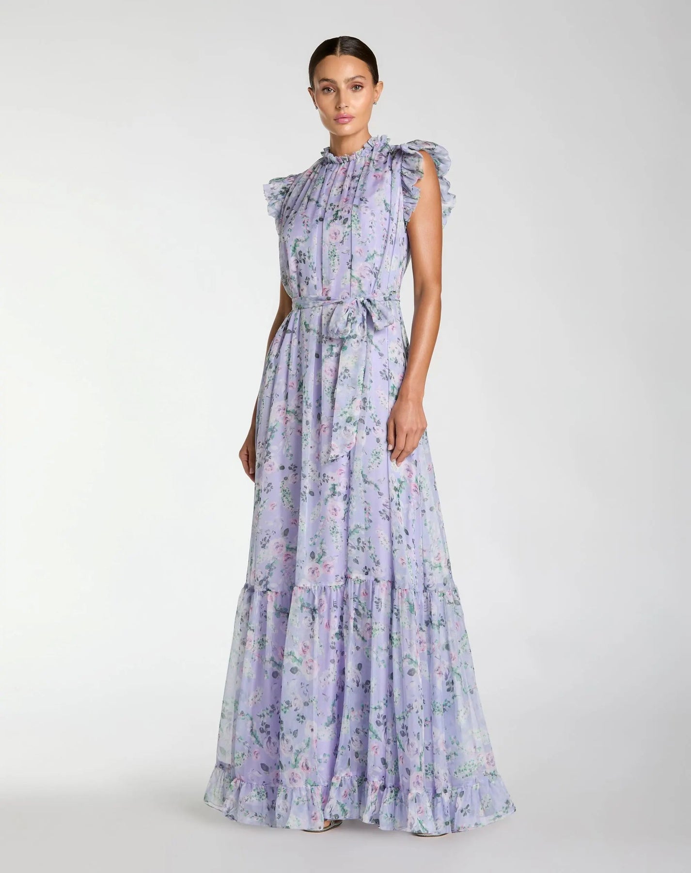 This stunning floral-printed chiffon gown features a chic mock neckline and elegant ruffle sleeves. The belted waist adds a flattering touch, making it the perfect choice for any occasion.