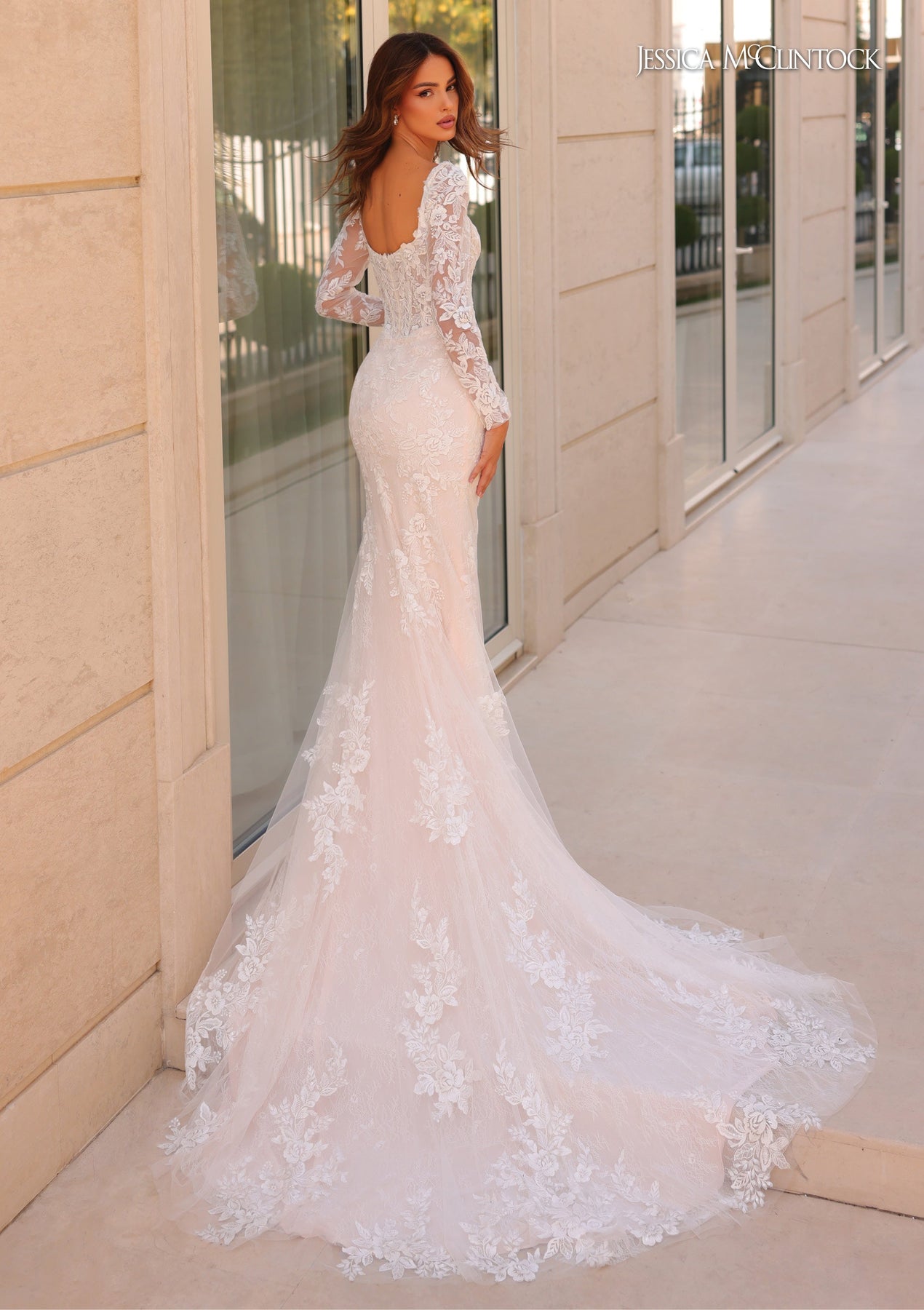This gorgeous fitted lace wedding dress will add a touch of elegance to your special day. The sheer lace sleeves are detachable, dramatically changing the look of the gown, while the sweeping train adds the final touch.