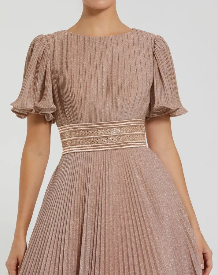 This elegant gown features flutter sleeves, a flattering ballgown silhouette, and shimmering lurex fabric. Perfect for any special occasion, the short flutter sleeves add a touch of romance while the shimmering fabric catches the light for a stunning look.