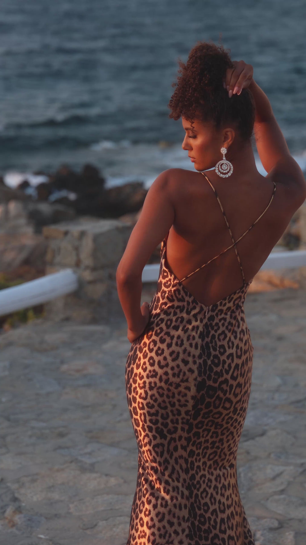 This playful long dress features a bold tiger design that adds a fierce touch to any occasion. With a flattering V-neck and an open back, it effortlessly blends elegance with a hint of daring. Perfect for turning heads, this dress combines comfort and style for a confident, standout look.