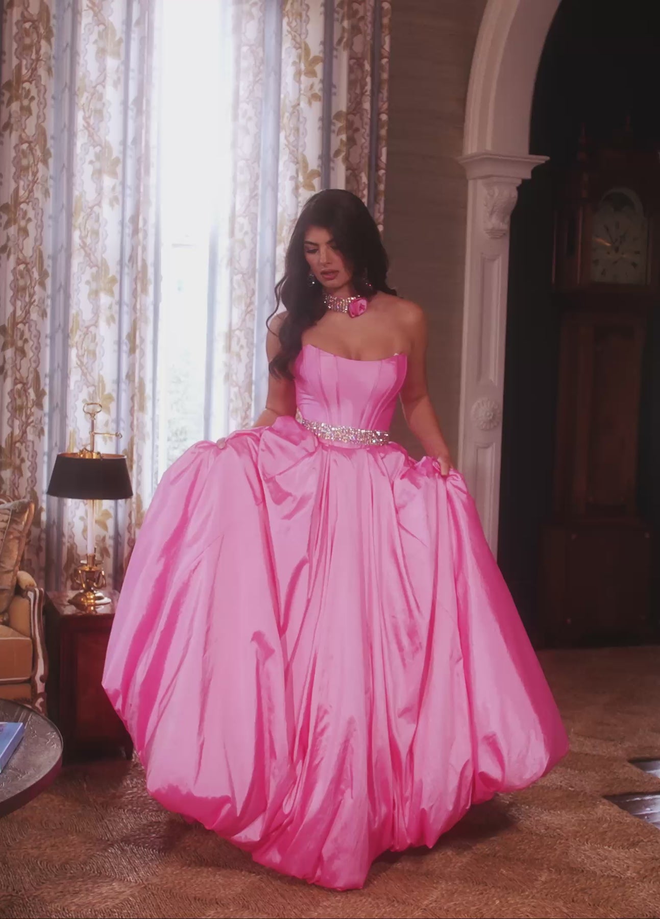 Make a grand entrance in this stunning taffeta ballgown, crafted to turn heads at every formal occasion. The elegant strapless bodice features a crystal-beaded belt that cinches your silhouette, while a dramatic bow and sweeping train deliver undeniable sophistication. A striking choker detail and voluminous skirt complete the look with pageant-ready glamour. Available in luxurious Candy Pink and serene Sage, this gown is your ticket to feeling absolutely radiant at galas, pageants, and unforgettable evening events.