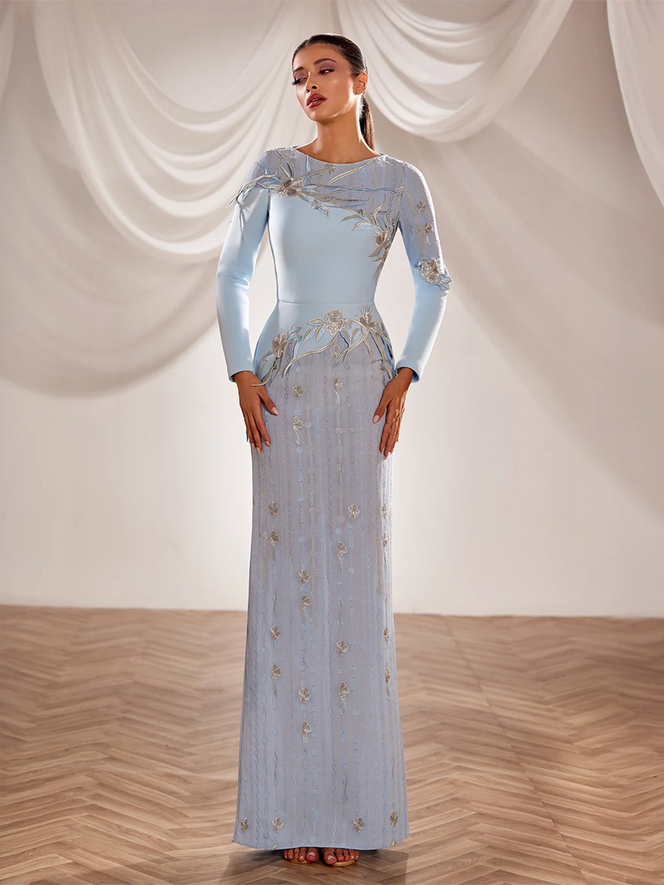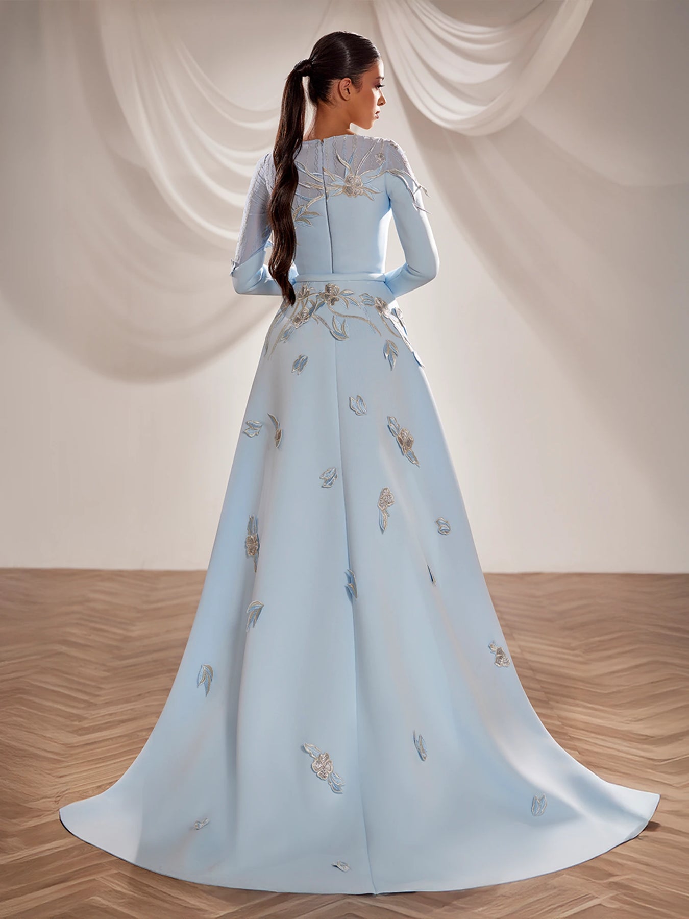 Dive into elegance with the Reverie Couture SS232, a stunning scuba blue gown that makes a splash at any occasion. Long, flowing sleeves add a touch of sophistication and grace, while the rich, jewel-toned fabric creates an effortlessly chic silhouette. Perfect for those who want to stand out with understated glamour, this dress transitions beautifully from evening events to special celebrations. Slip into something that feels as good as it looks.