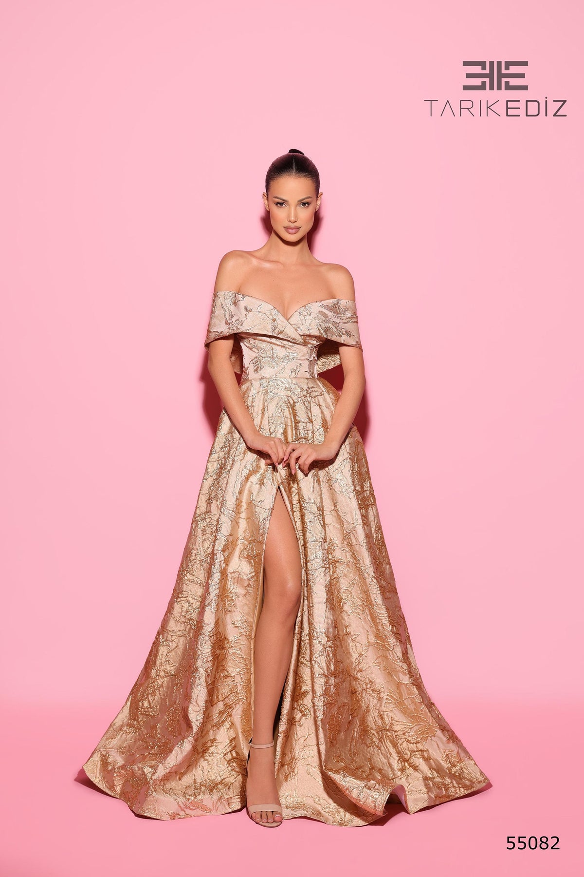 Tarik Ediz 55082 is your ticket to turning heads at any formal affair! This show-stopping A-line gown features a luxurious jacquard fabric that feels as divine as it looks. The flirty off-the-shoulder neckline and sweetheart bodice work together to highlight your best features, while a daring thigh-high slit keeps things exciting with every stride. Whether you're the mother of the bride or the guest stealing the spotlight, this fit-and-flare beauty drapes elegantly to the floor with effortless sophistication. Get ready to own the room in this glamorous masterpiece.