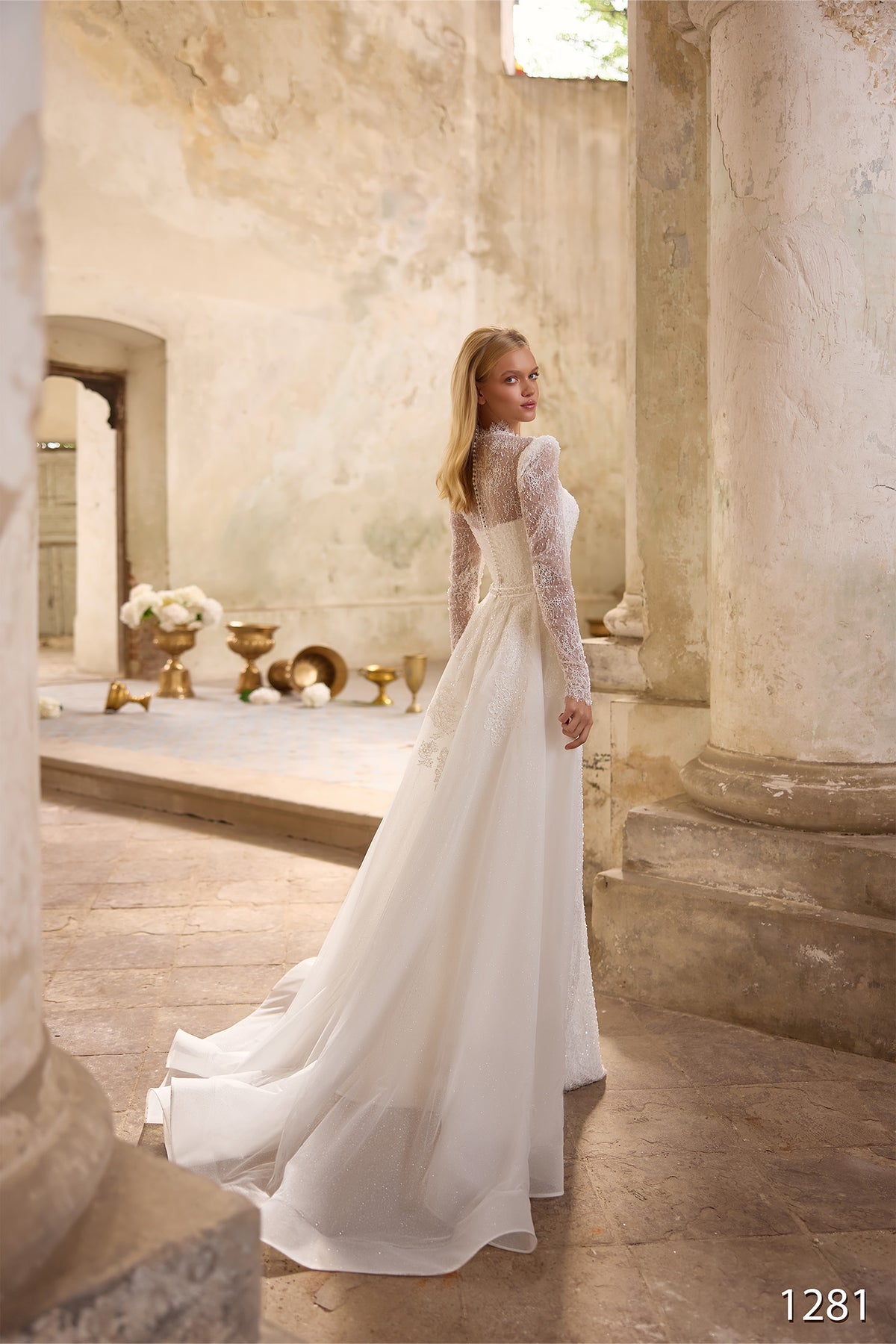 The Vissaria 1281 Dress is an elegant choice for your special day. This stunning bridal gown features a graceful long silhouette with full-length sleeves that provide sophisticated coverage and timeless appeal. The high neckline adds a touch of refined elegance while creating a flattering frame for your face and shoulders. Crafted with bridal beauty in mind, this dress combines classic design elements with modern grace, ensuring you feel confident and radiant as you walk down the aisle. Perfect for the bride seeking understated luxury and enduring style.