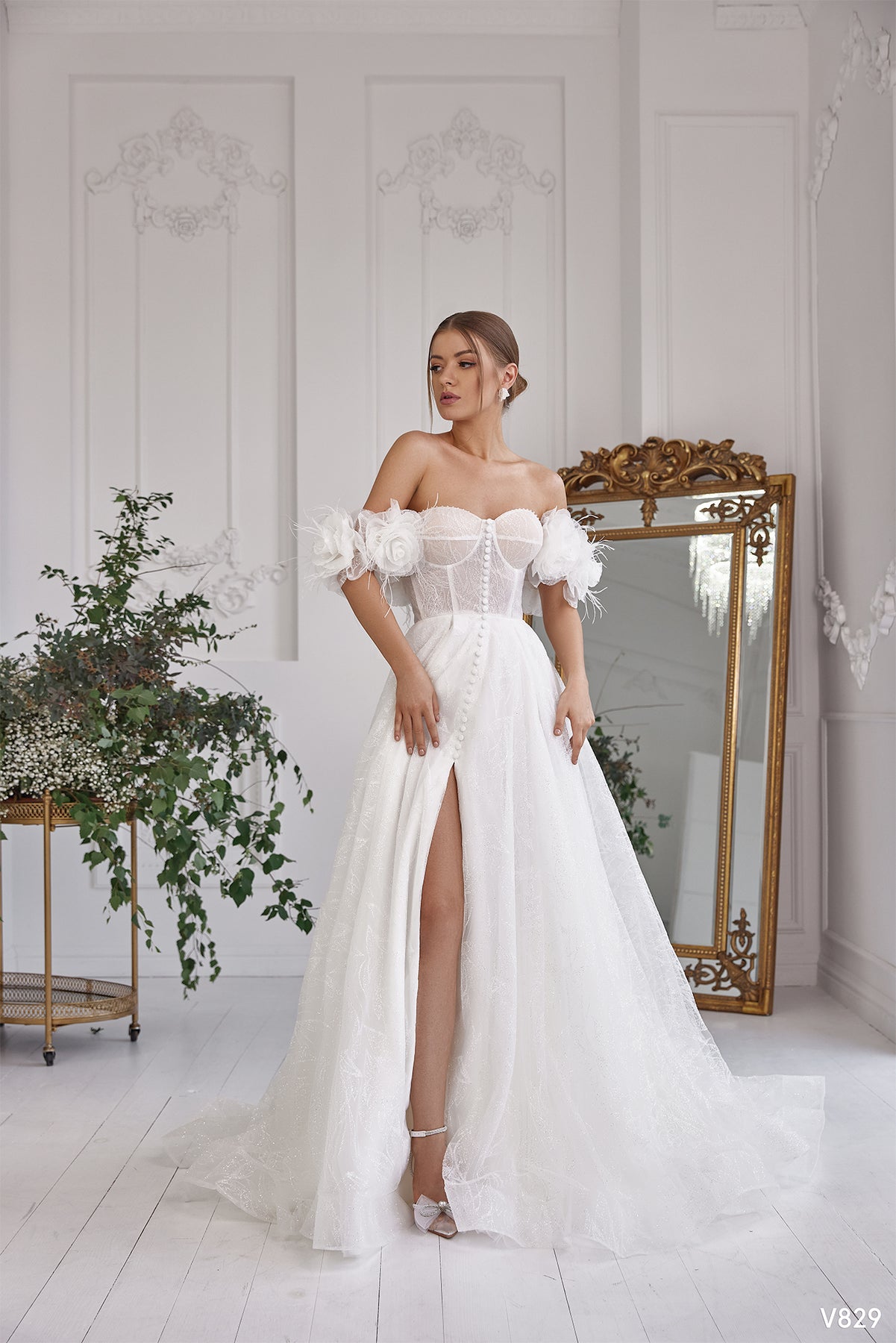 The Vissaria 829 Dress is a stunning bridal choice that celebrates your special day with timeless elegance. This enchanting gown features a romantic sweetheart neckline and charming puff sleeves that frame the shoulders beautifully, while the off-shoulder design adds a touch of modern sophistication. The high slit creates a graceful silhouette that moves with confidence as you walk down the aisle. Perfect for the bride who wants to feel both classic and contemporary, this dress combines feminine details with flattering cuts that will make you feel absolutely radiant on your wedding day.