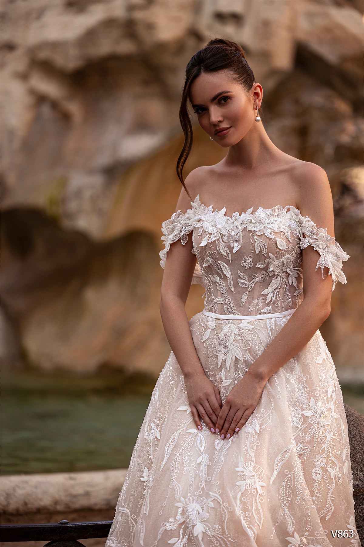 The Vissaria 863 Dress is a stunning off-shoulder gown designed for your most memorable moments. This sleeveless masterpiece features an elegant open back that creates a dramatic, romantic silhouette. The flowing long design offers timeless sophistication, making it an ideal choice for brides seeking a dress that combines modern style with classic elegance. Perfect for creating unforgettable memories on your special day.