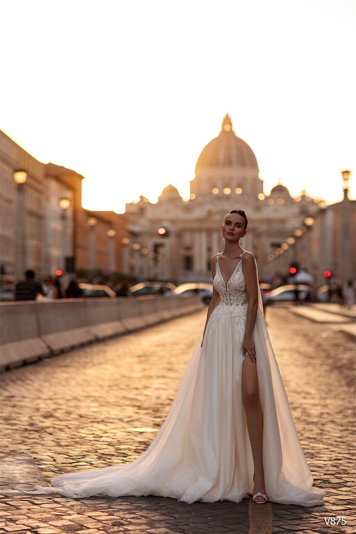 The Vissaria 875 Dress is a stunning choice for your special day. This elegant sleeveless gown features a flattering V neckline and daring open back that creates an unforgettable silhouette. The flowing long skirt showcases a dramatic high slit for graceful movement and modern sophistication. Perfect for brides seeking a dress that balances timeless elegance with contemporary style, this piece celebrates your confidence and beauty.