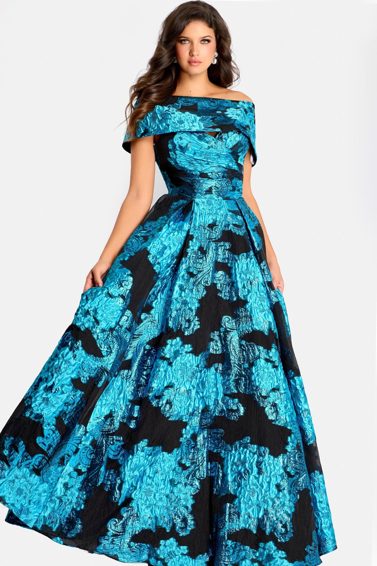 Elevate your evening with the stunning Jovani 47630 Dress, a floor-length gown designed to make you feel absolutely radiant. This A-line silhouette features an elegant off-the-shoulder neckline with short sleeves and a folded detail that frames your shoulders beautifully. The fitted waist flows into a full, graceful skirt crafted from luxurious jacquard fabric adorned with a shimmering metallic floral pattern. A secure back zipper and closed back design ensure a polished, put-together look from every angle. Perfect for formal events, galas, or special occasions where you want to shine with confidence and sophistication.