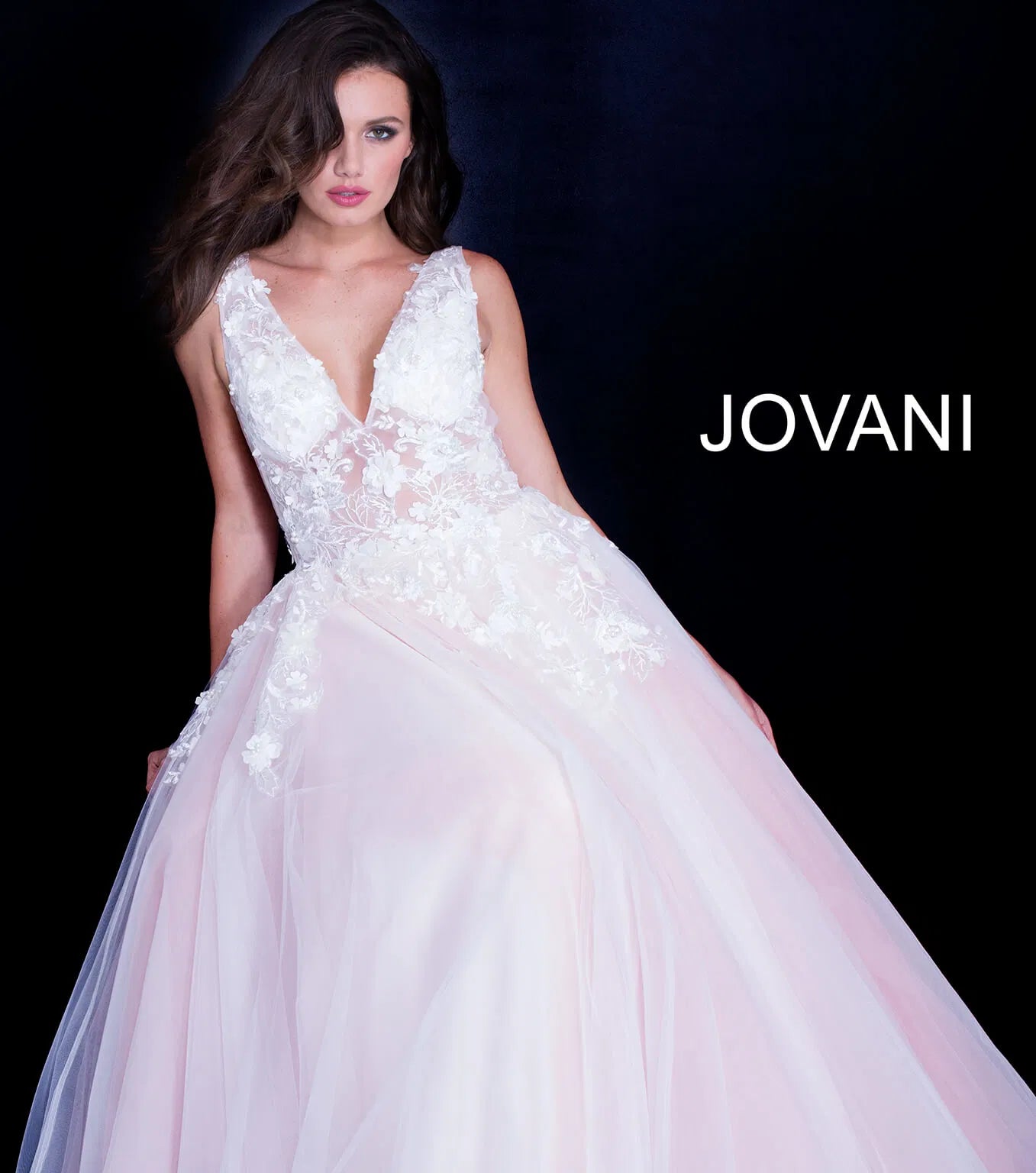 Elevate your evening with the stunning Jovani 55634 Dress, a show-stopping floor-length gown designed to make you feel absolutely radiant. This sleeveless A-line ballgown features an elegant V-neckline and an alluring open back that adds modern sophistication. Crafted from luxurious sheer tulle, the dress is adorned with intricate floral appliques, delicate rosettes, and shimmering sequins that catch the light beautifully. The zipper closure ensures a perfect fit, while the voluminous silhouette flatters every figure. Perfect for galas, and unforgettable celebrations, this dress combines timeless elegance with contemporary glamour.