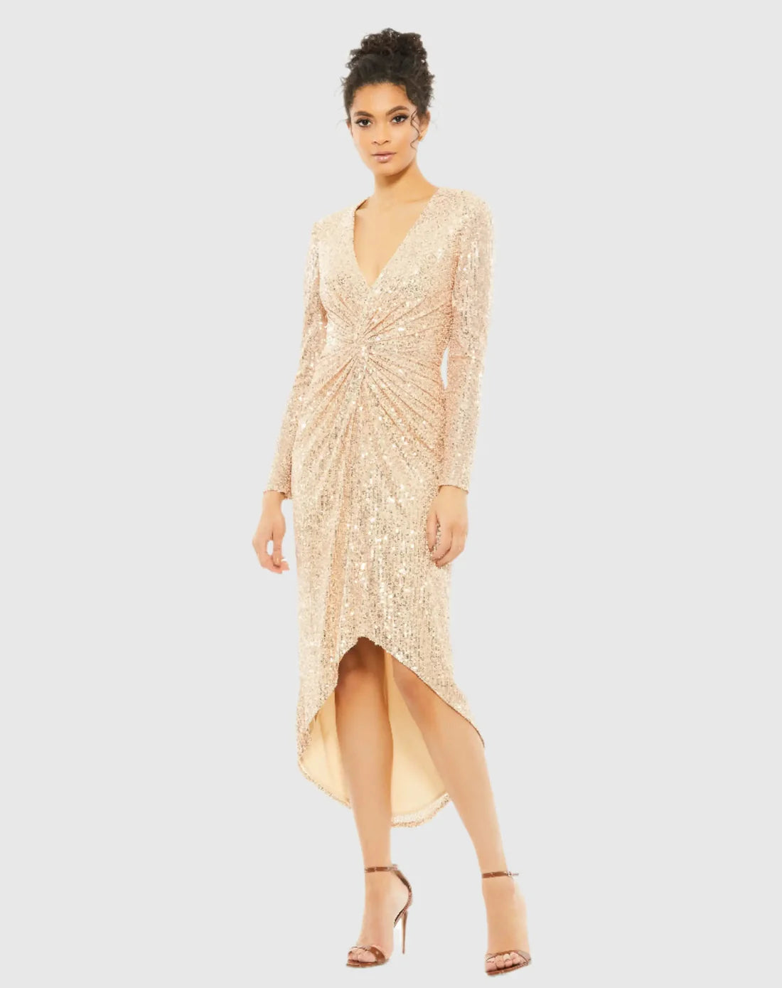 Long-sleeved, fully-sequined cocktail dress with a v-neckline, knot detailing at the waist, and a hi-low hem.