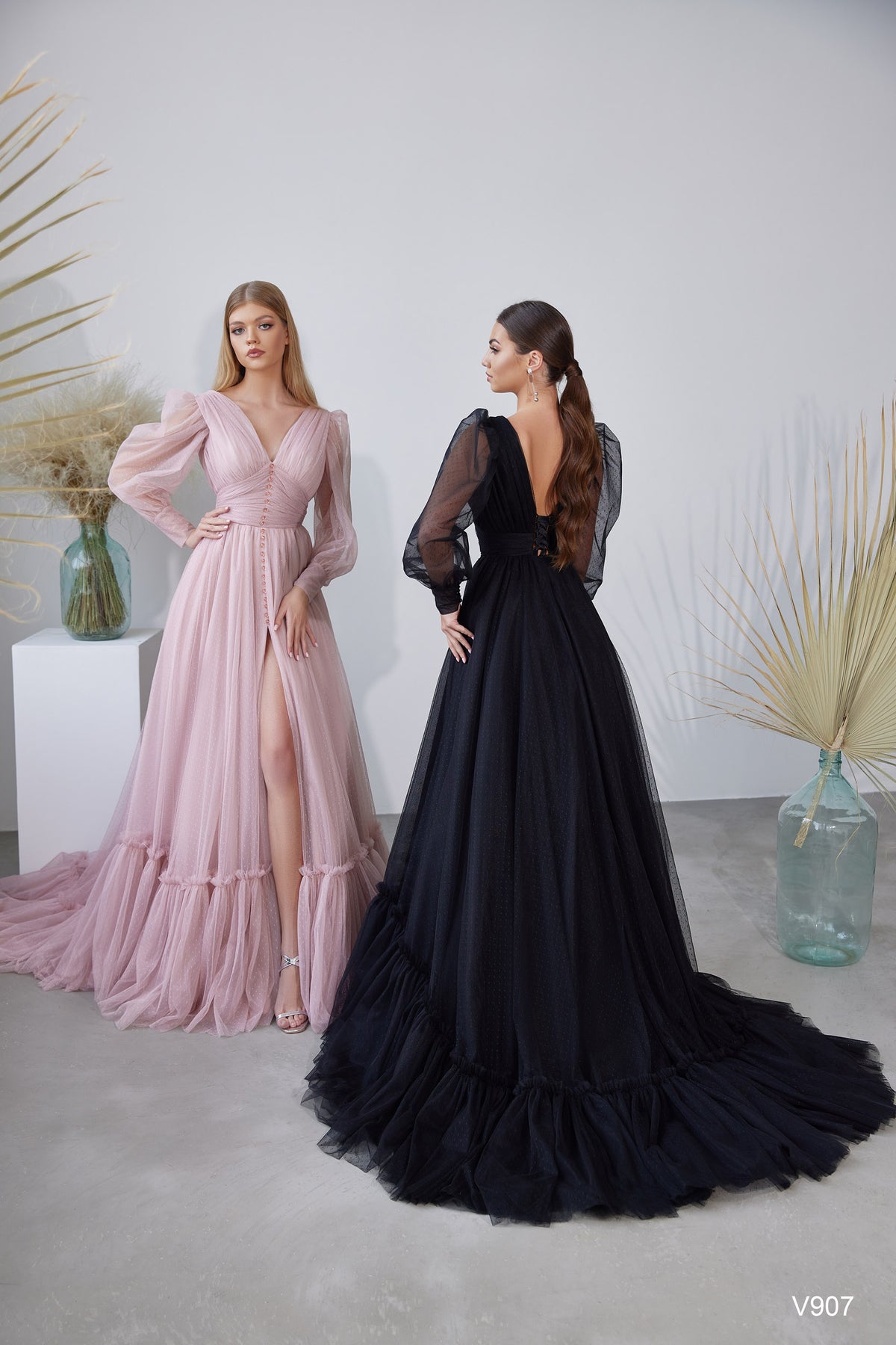 The Vissaria 907 is your ticket to effortless elegance with a playful twist. This stunning long dress features a flattering V-neckline that draws the eye upward, while the daring open back adds just the right amount of allure and sophistication. Long sleeves provide graceful coverage, and the high slit keeps things interesting with every step you take. Perfect for evening events, special occasions, or whenever you want to feel absolutely fabulous. Dress it up with heels and statement jewelry, or keep it cool and confident on its own. This is the dress that makes you feel like the best version of yourself.